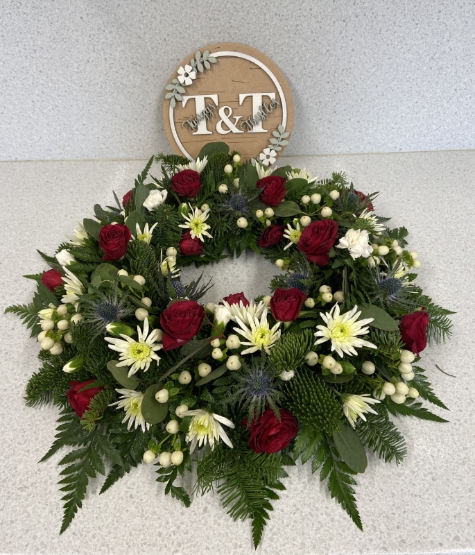 A festive wreath ideal to lay at your loved one's grave. Made with fresh holly, spruce, berries and festive accessories.